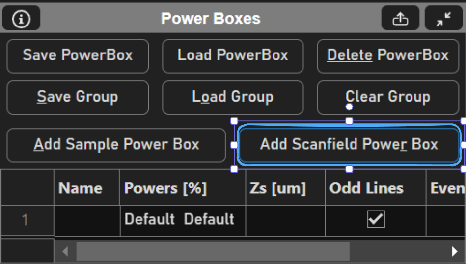 To add the Scanfield power box, click the Add Scanfield Power Box button.