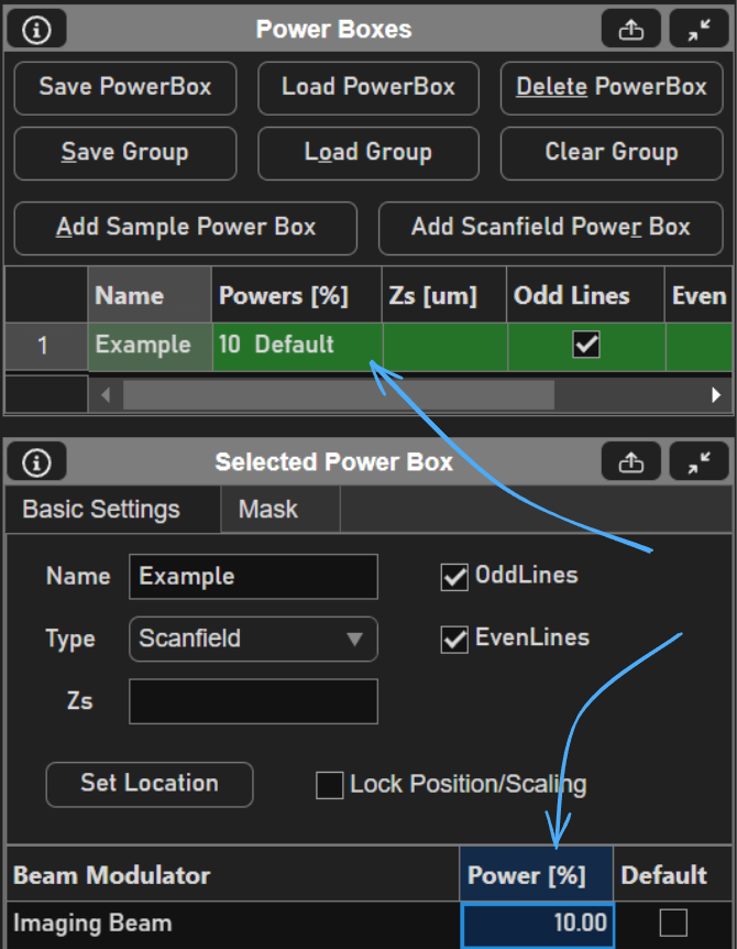 Controlling beam power for specific locations in the scanfield is done with a feature named Power Box.