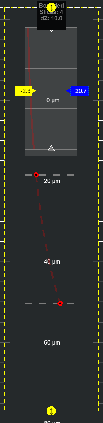 To adjust the top and bottom depths for determining the characteristic length from the viewport, the grey, dashed, horizontal lines can be dragged up and down. To adjust the power and the depth for a top or bottom depth, the red dot on the gray dashed line can be dragged horizontally to adjust power and vertically to adjust depth. Dragging the red dot horizontally is the same as clicking and dragging the beams slider.